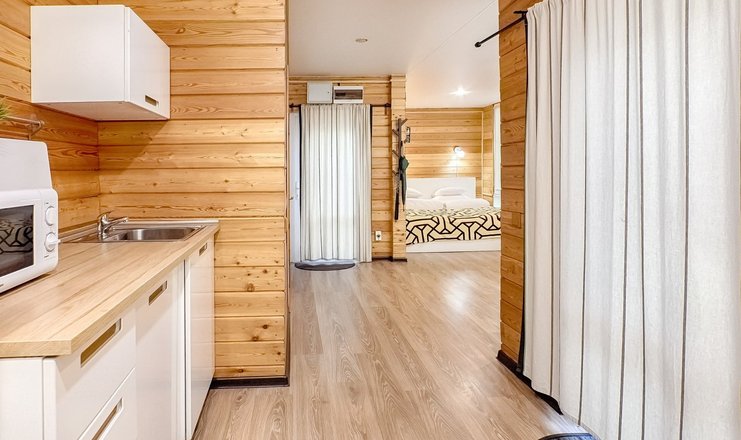 В номере: Кухня, вешалка, зеркало, комод, кровать двуспальная, кухонная мебель, стол, стулья, шкаф, микроволновая печь, набор посуды, телевизор, чайный набор посуды, электрочайник