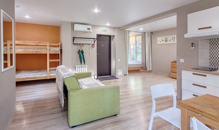 В номере: вешалка, диван раскладной, кровать двуспальная, кровать двухъярусная, кухонная мебель, прикроватные тумбочки, стол, стулья, тумба под телевизор, шкаф, микроволновая печь, плита электрическая, телевизор, холодильник, чайный набор посуды, электрочайник